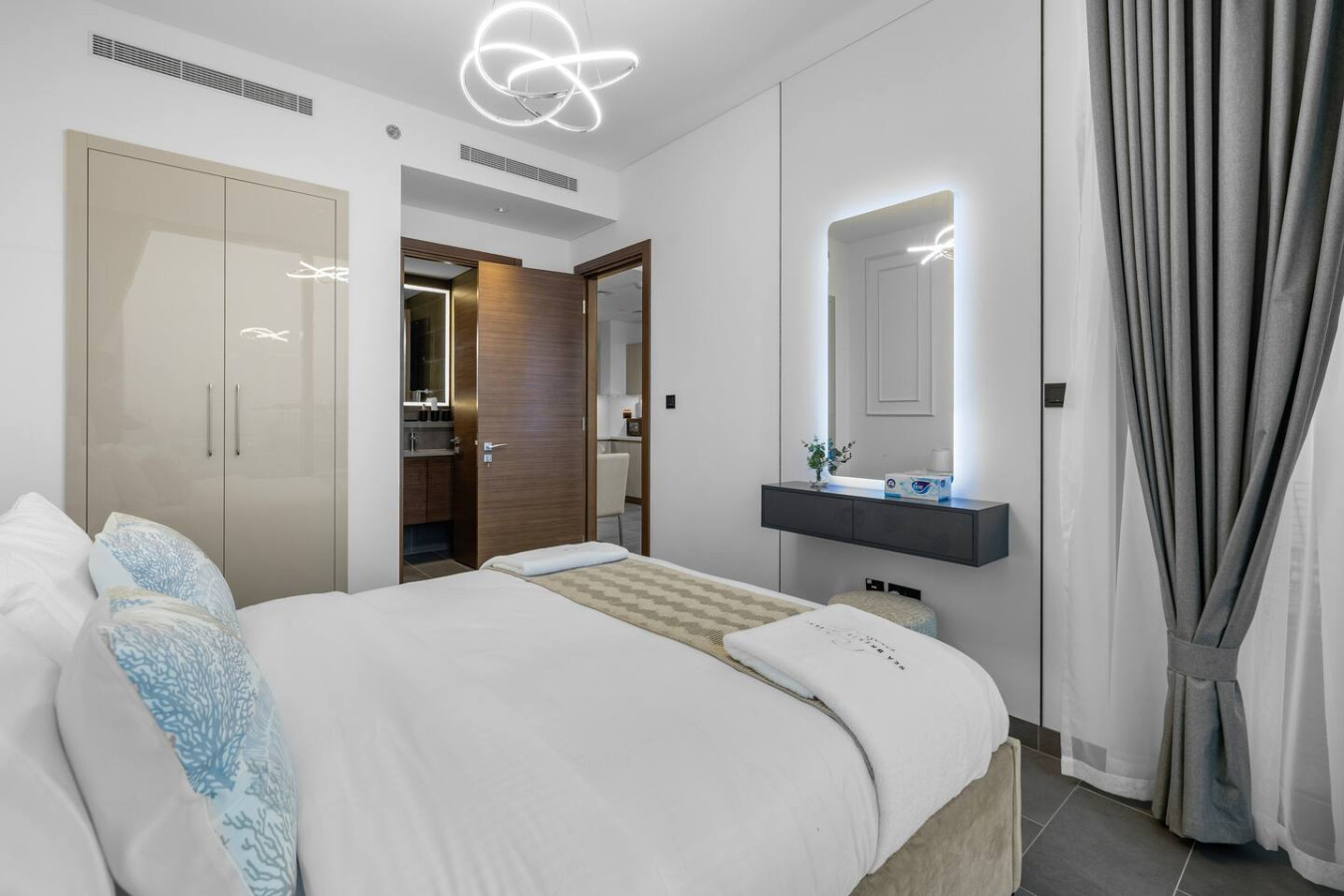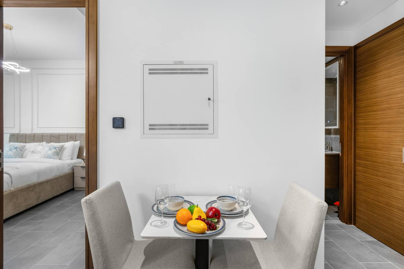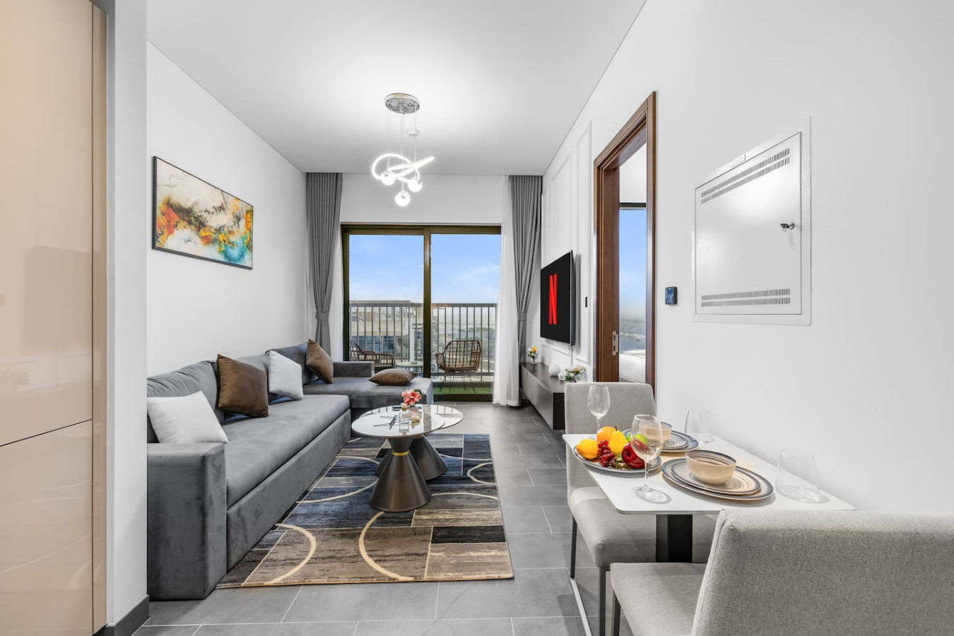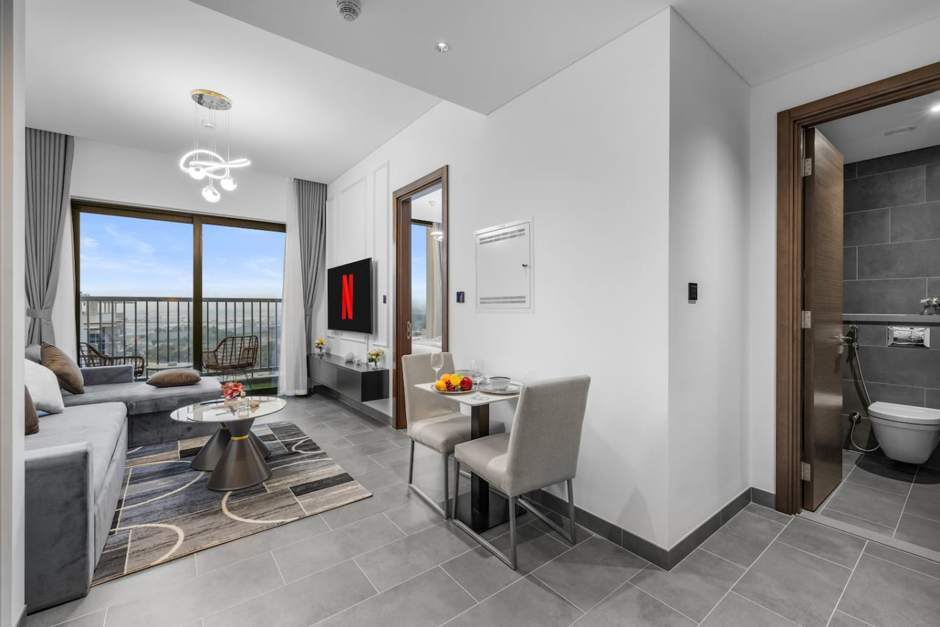 Experience stylish comfort in this thoughtfully designed one-bedroom apartment, complete with a private balcony for fresh air and city views. The bedroom features an ensuite bathroom for added privacy, while a separate powder room offers convenience for guests. Whether you're here for business or leisure, this space provides a relaxing retreat.