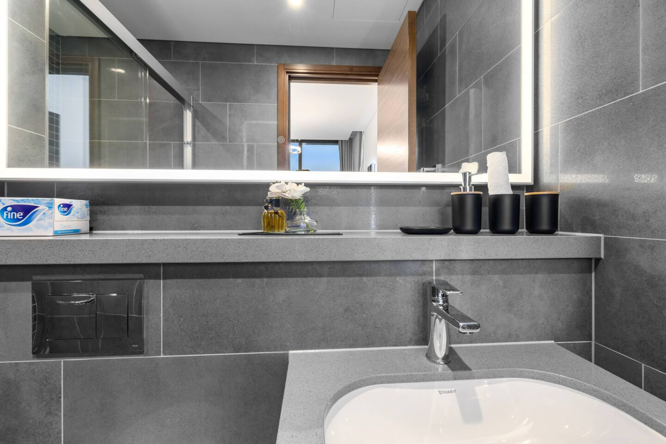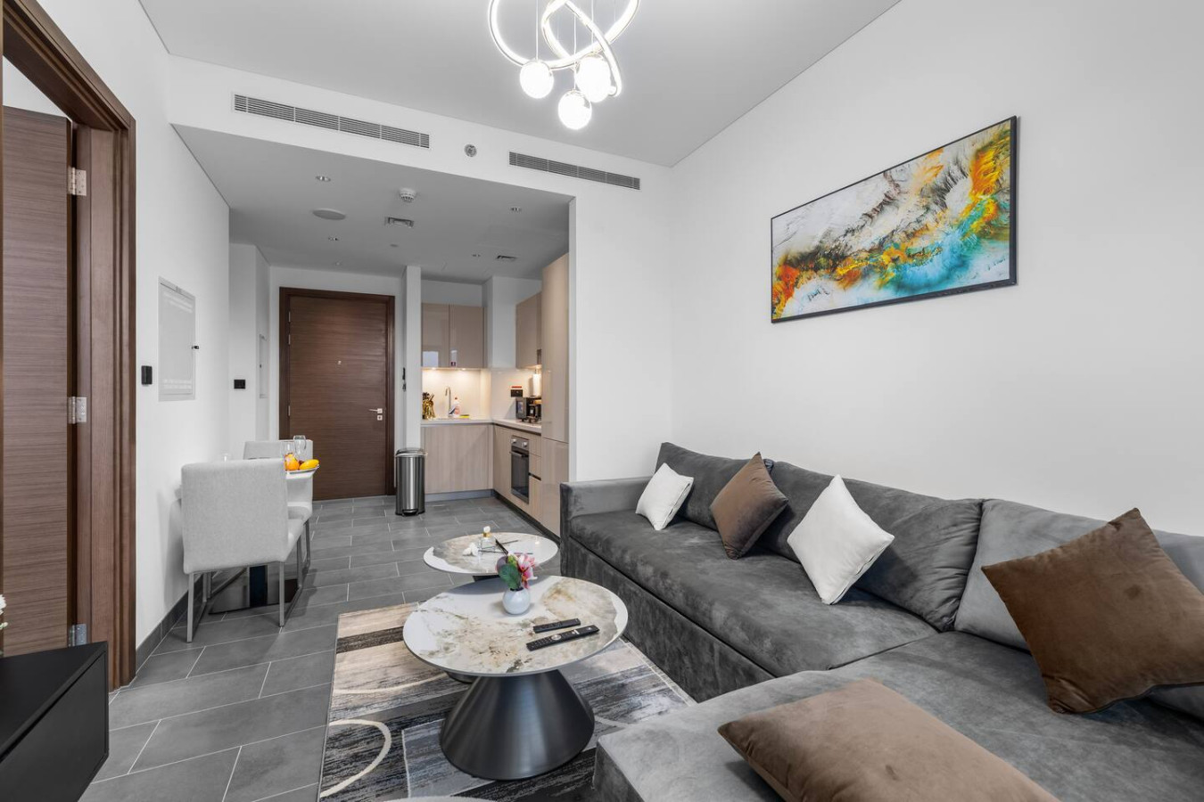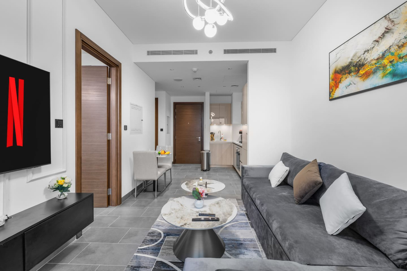 Experience stylish comfort in this thoughtfully designed one-bedroom apartment, complete with a private balcony for fresh air and city views. The bedroom features an ensuite bathroom for added privacy, while a separate powder room offers convenience for guests. Whether you're here for business or leisure, this space provides a relaxing retreat.