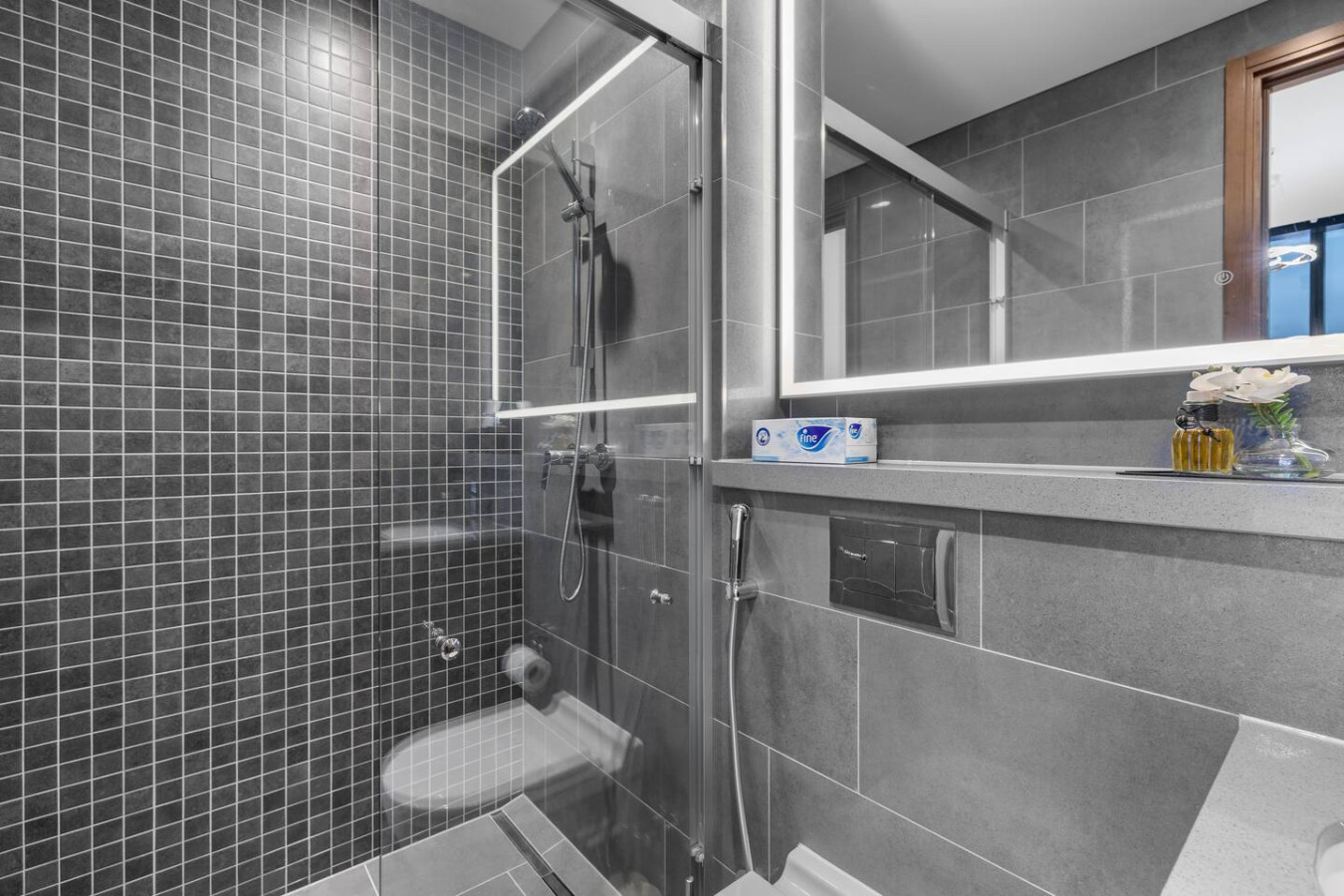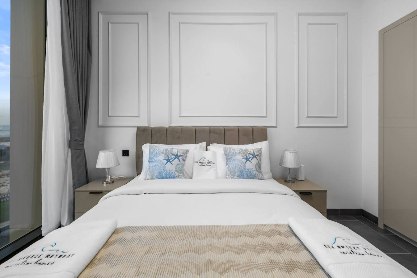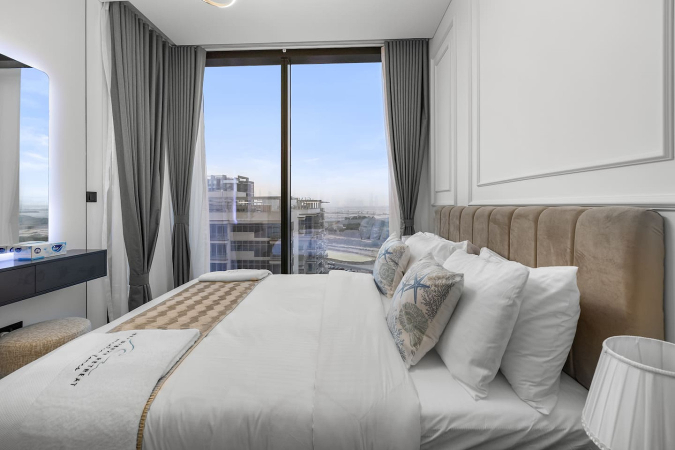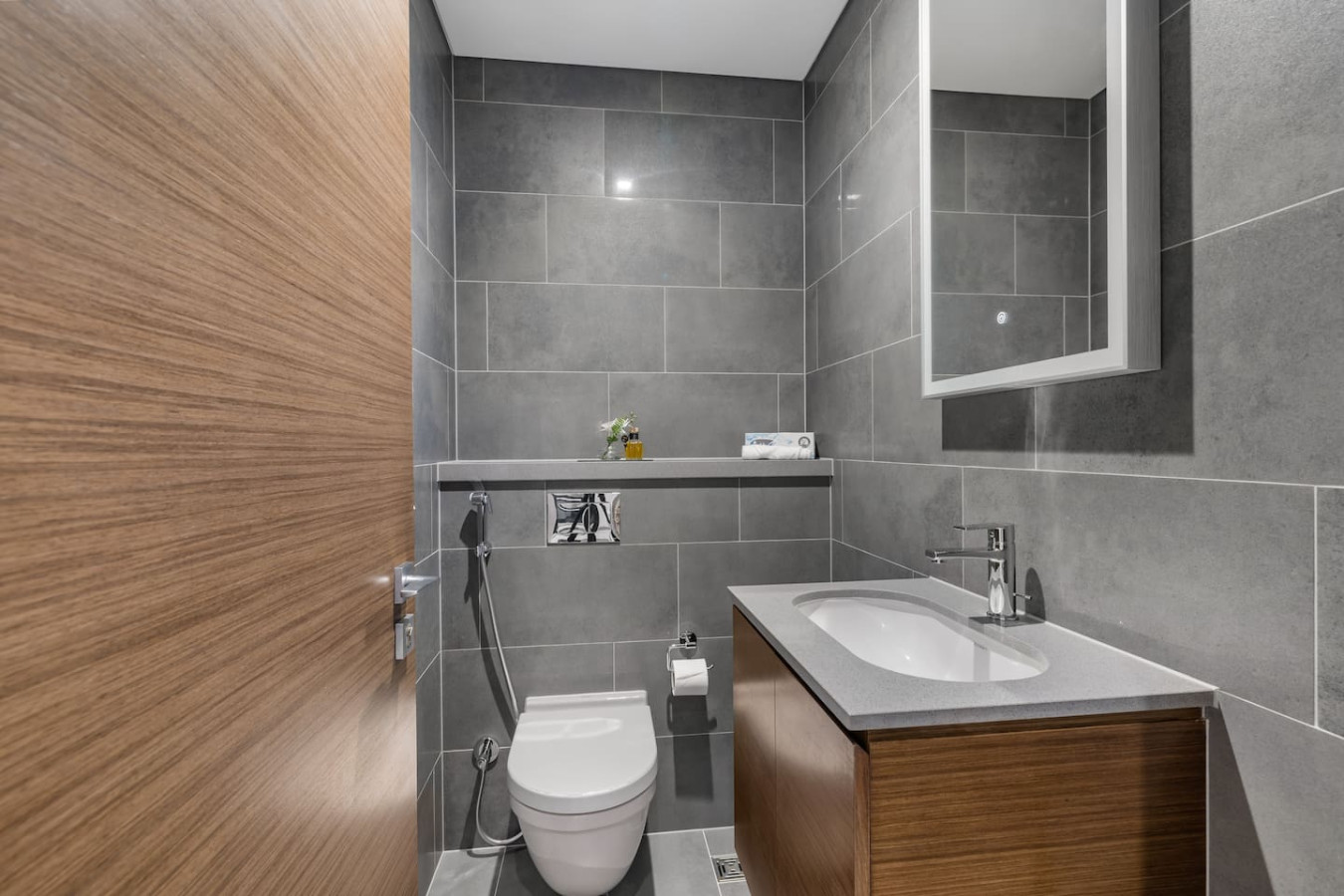 Experience stylish comfort in this thoughtfully designed one-bedroom apartment, complete with a private balcony for fresh air and city views. The bedroom features an ensuite bathroom for added privacy, while a separate powder room offers convenience for guests. Whether you're here for business or leisure, this space provides a relaxing retreat.
